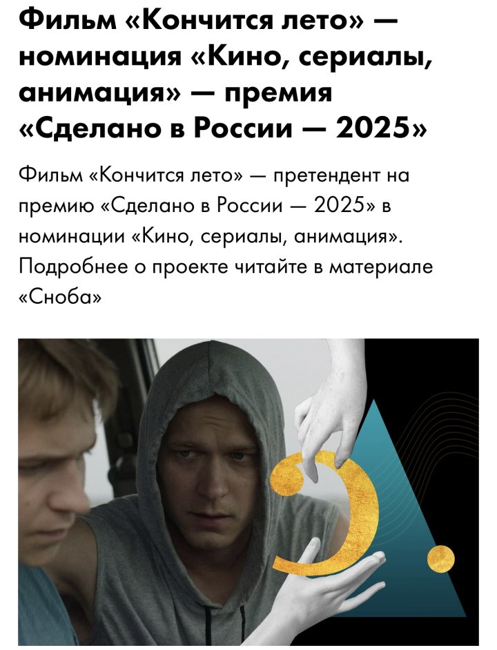 Фильм "Кончится лето" попал в шорт лист премии журнала Сноб "Сделано в России"